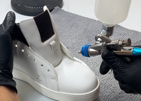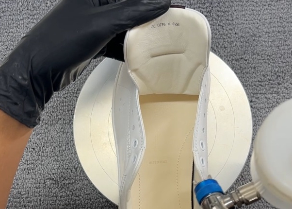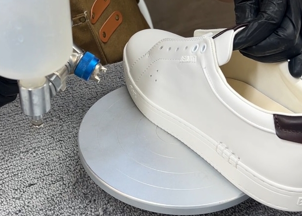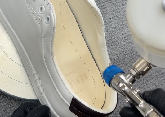 そんなお悩みを解決するのがマジベルコーティング。撥水効果だけではなく、ホワイトレザーの大敵、傷対策にも有効的になるのが特徴です。今回のはシューレース以外は全てレザーを使用しておりますので防汚・耐傷対策の施工から始めていきます。マジベルコーティングは素材にコーティング剤が浸透定着することで、よりレザーの耐久性を向上させていきます。レザー専用のコーティング剤を表面に大量に吹き付けて固めるのではなく、薄く何層も塗布することでシボの中まで浸透させより耐久性や防汚性を高めていくのが特徴です。