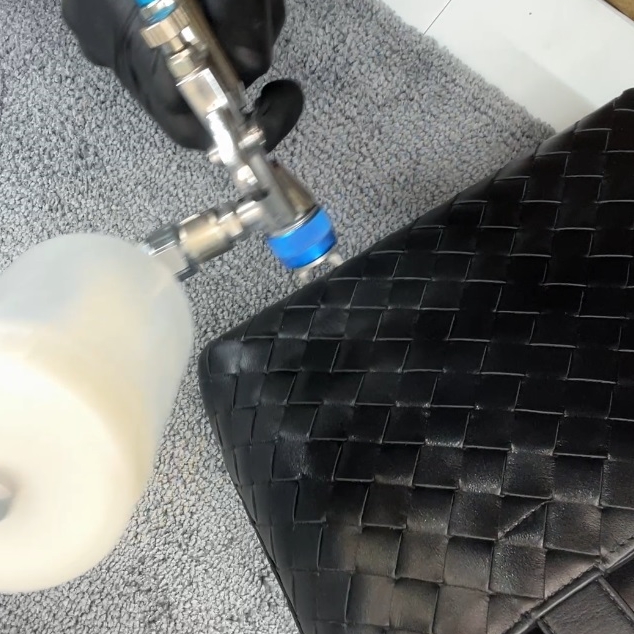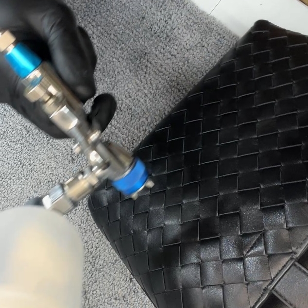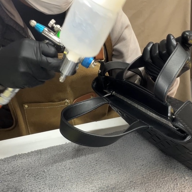 続いて、ハンドル部分の施工をおこなっていきます。手に触れることが一番多い部分になりますので、念入りに施工をおこないます。皮脂汚れや擦れなどの劣化を抑える効果があります。ショルダーベルトは、手塗で施工をおこないます。交差する見えない部分のレザーにコーティングをするため、スプレーは使用いたしません。
