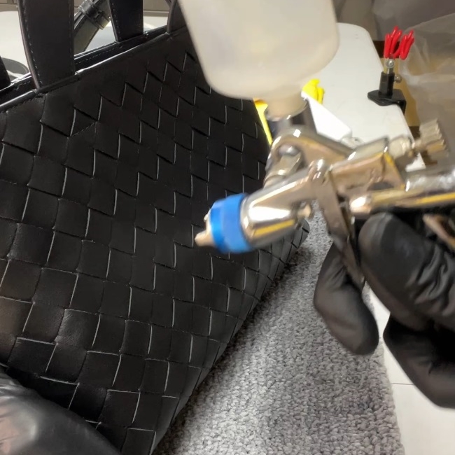 バッグ全体が、レザー素材を使用しているため、傷や撥水に強いレザー専用のコーティング剤を使用していきます。レザーがムラにならない様に、薄く満遍なくコーティングをおこなっていきます。擦れが気になる底面や角にも丁寧に施工をおこなっていきます。レザーへの浸透性が良い為、レザーの強度が高くなります。見た目や質感は全くコーテイング前とは変わりません。