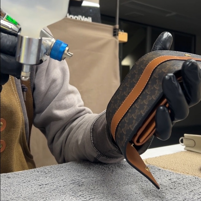 施工についてご紹介いたします。アイテムにはカーフスキンを使用しておりますので、レザー専用のコーティング剤で施工をおこなっていきます。特に表面は手に持つ機会が多いことから、皮脂汚れやファンデーション、擦れや傷が付きやすい部分の為、傷が付きにくく、汚れが取れやすくなるコーティングで、レザーに耐久性を持たせていきます。コバ部分は塗漏れが無いように、細かく手塗で施工をおこなっていきます。