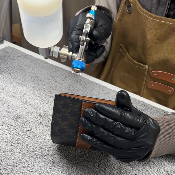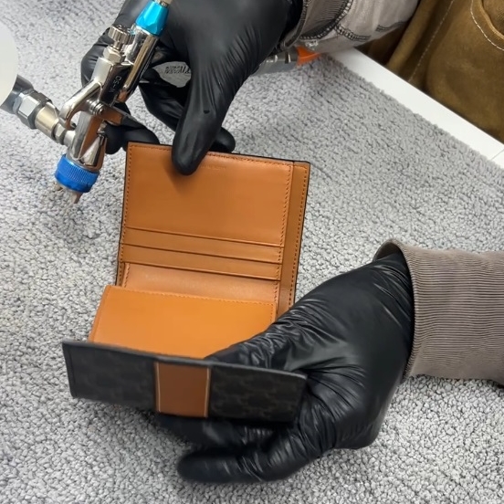 続いて、内側のカードスロットル、コインケース、お札収納などのポケット一つひとつ施工をおこなっていきます。スプレーガンでは届かないパケットの奥は、手塗で塗漏れが無いように施工をおこなっていきます。施工は、数回おこないますので、通常の耐久性より向上いたします。確り乾燥させ、素材に馴染ませれば施工は完了です。