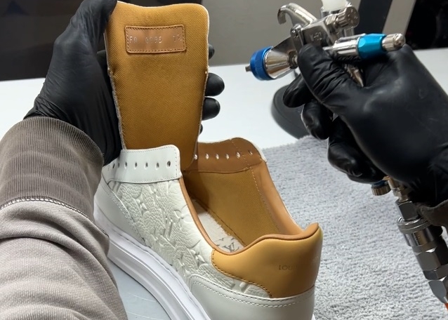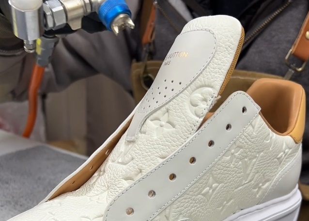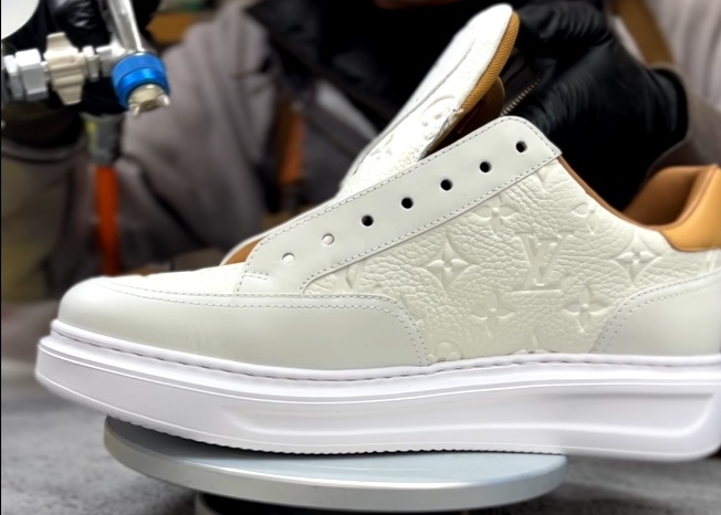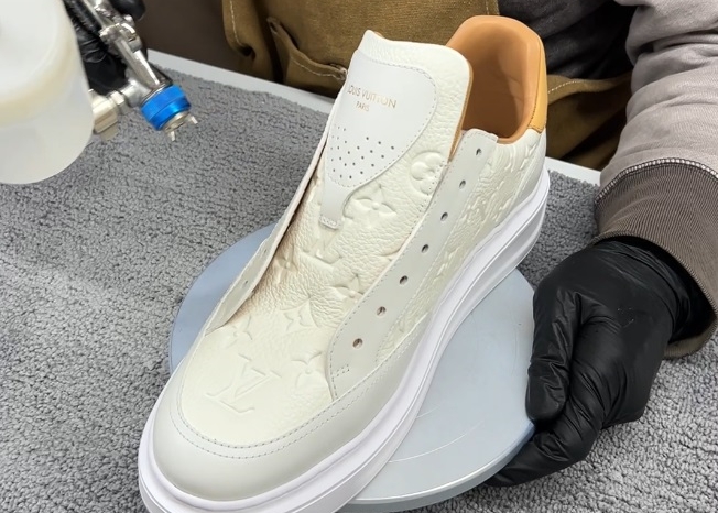 このスニーカーの施工内容になります。全体に使用されている素材は、モノグラム・パターンをエンボス加工したグレインカーフレザーで、ホワイトの為、傷対策のコーティングをおこなっていきます。トゥやアッパー、シュータン全てに耐傷性の高いレザー専用のコーティングを塗布していきます。ベージュ色のレザーは、使用いる間に色落ちしてしまうこともありますので、レザーの上からコーティングをすることで、色落ち対策にも有効的な施工です。