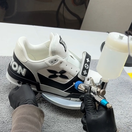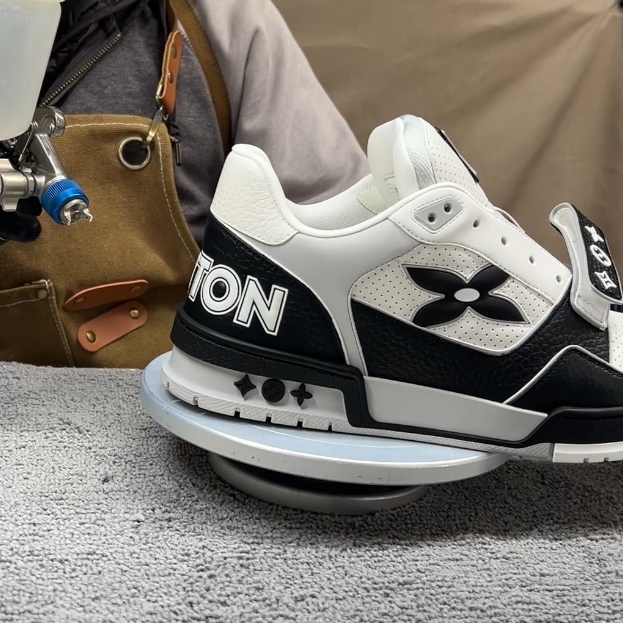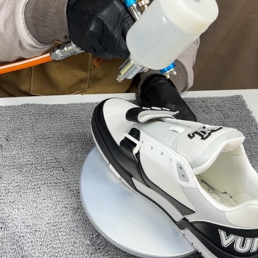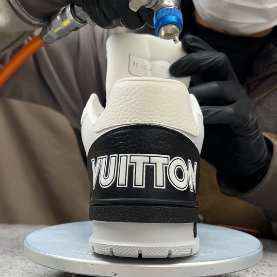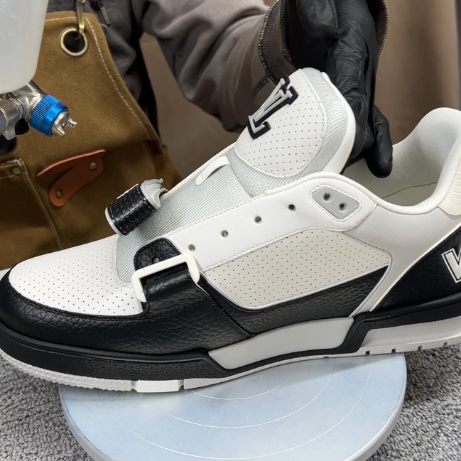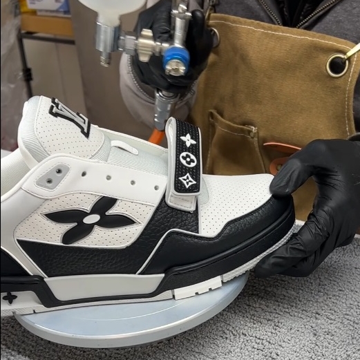 皆さん、こんにちは!今回はLouis Vuitton LV トレイナー スニーカーマジベルコーティング施工いたします。人気の高い、このスニーカーは、スムースレザーにピンポイントのパーフォレーションを施して再解釈された、アイコニックな「LV トレイナー スニーカー」です。ヴィンテージのバスケットボールシューズから着想を得たモデルは、精緻な構造のアッパーと複数のシグネチャーディテールが特徴となっています。サイドにはモノグラム・フラワーを、背面にはアシンメトリーな「Louis」と「Vuitton」のシグネチャーをあしらわれており、デザイン性も高く調節可能なベルクロストラップが装備されており、、履きやすさも抜群なスニーカー。