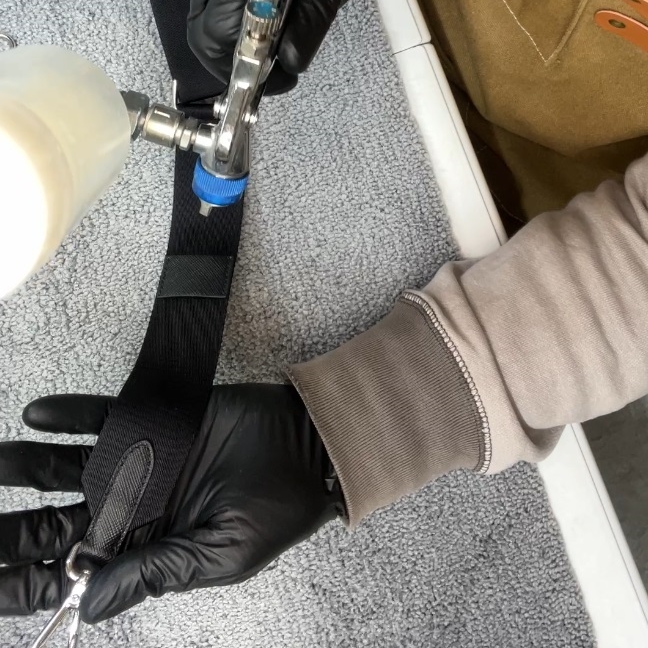 施工内容は、バッグの表面・内側はもちろん、ミニポーチ、ショルダーベルト全てに施工をいたします。防汚、撥水効果をもたらします。大切なアイテムを保護するには、有機溶剤を使わないマジベルコーティングが有効です。素材の風合いを変えることなく施工いたします。ご施工のご依頼有難う御座いました。
