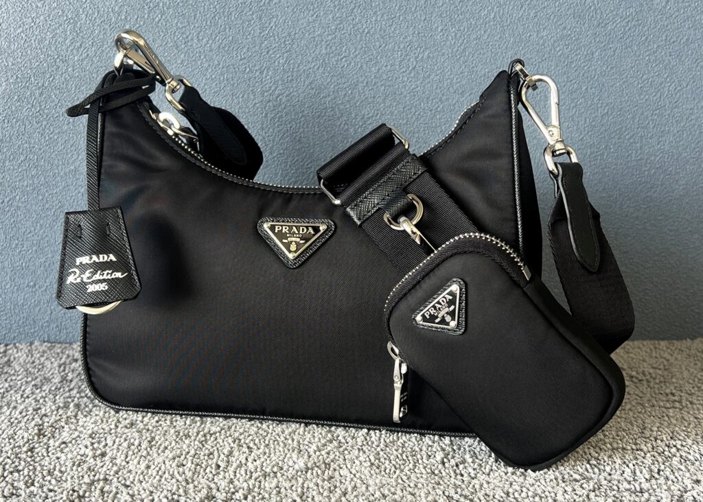PRADA Re-Edition 2005 Re-Nylon 2WAYショルダーバッグは、2005年に登場したプラダのアイコニックなナイロンバッグを、現代的にアップデートしたモデルです。素材には、海洋プラスチックや繊維廃棄物を再生して作られたサステナブル素材「Re-Nylon(リナイロン)」を使用しており、軽量で耐久性に優れながら、環境にも配慮されています。デザインはコンパクトで無駄のないシルエットが特徴で、プラダらしい洗練されたミニマルさが際立ちます。付属のストラップにより、肩掛けと斜め掛けの2WAYで使用でき、シーンやコーディネートに合わせて使い分けが可能です。また、取り外し可能なミニポーチが付属している点も実用性が高く、小物の収納やアクセントとしても活躍します。フロントにはプラダを象徴するトライアングルロゴが配され、シンプルながらもブランドの存在感をしっかりと主張します。カジュアルからきれいめまで幅広いスタイルに合わせやすく、日常使いはもちろん、トレンド感のあるコーディネートにも自然に馴染むバッグとして、多くの支持を集めているモデルです。