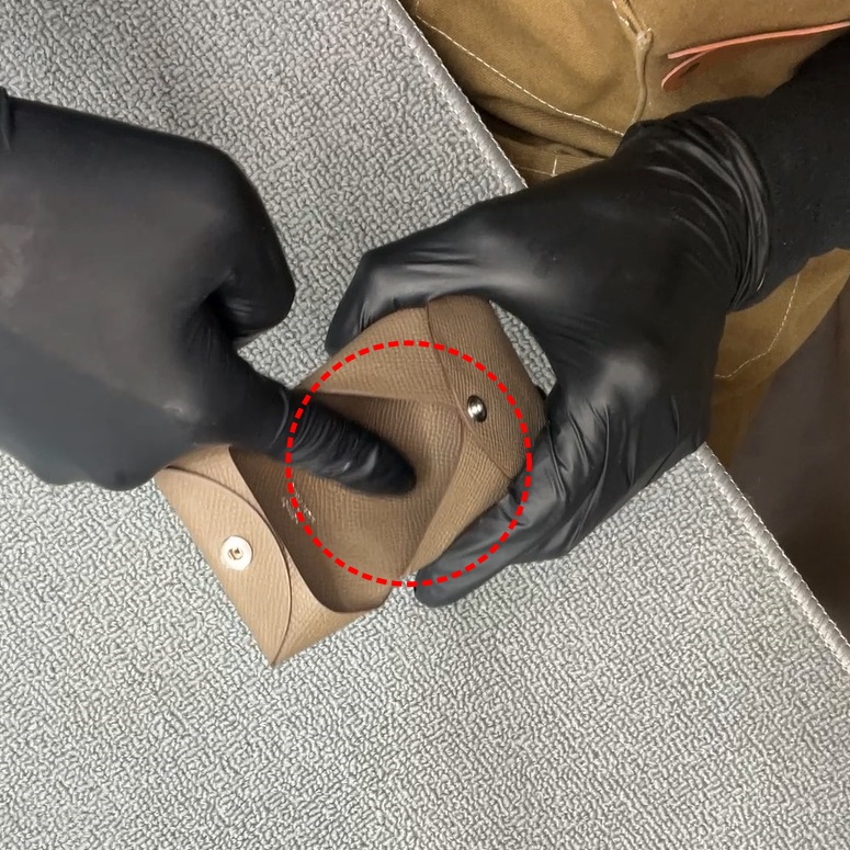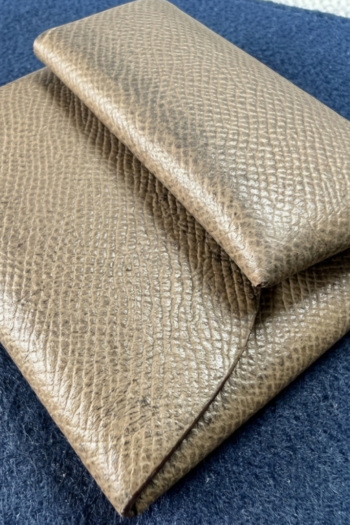 「角部分の黒ずみ」: ポケットやバッグからの出し入れ、指先で触れる箇所が、わずか数ヶ月で皮脂を吸い込み、エトープ特有の気品を損なう黒ずみへと変わります。